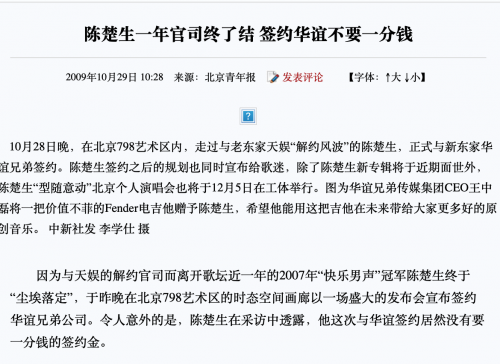 在陈楚生签约华谊兄弟前后,他与天娱传媒进行着开庭-宣判-不服从宣判-再次上诉的循环。虽然2009年底已经确认解约,但一直到2011年,对于陈楚生是否应该赔偿天娱传媒,具体要赔多少,都没有一个准确的答案。