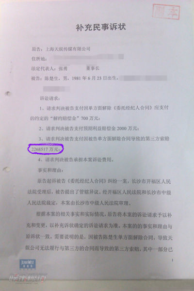 2011年7月,陈楚生的经纪人周杰突然发了微博,贴出了大半年前从天娱传媒代理律师处收到的《补充民事诉状》。而这,就是227亿的源头——